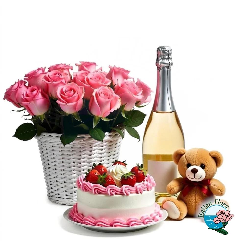 Indulge your loved one with a luxurious and heartfelt gesture from Italian Flora. This enchanting gift set combines the passion of 18 radiant pink roses, the comfort of a cuddly teddy bear, and the sophistication of a fine bottle of sparkling wine – the perfect trio for romance, celebration, and meaningful connection.