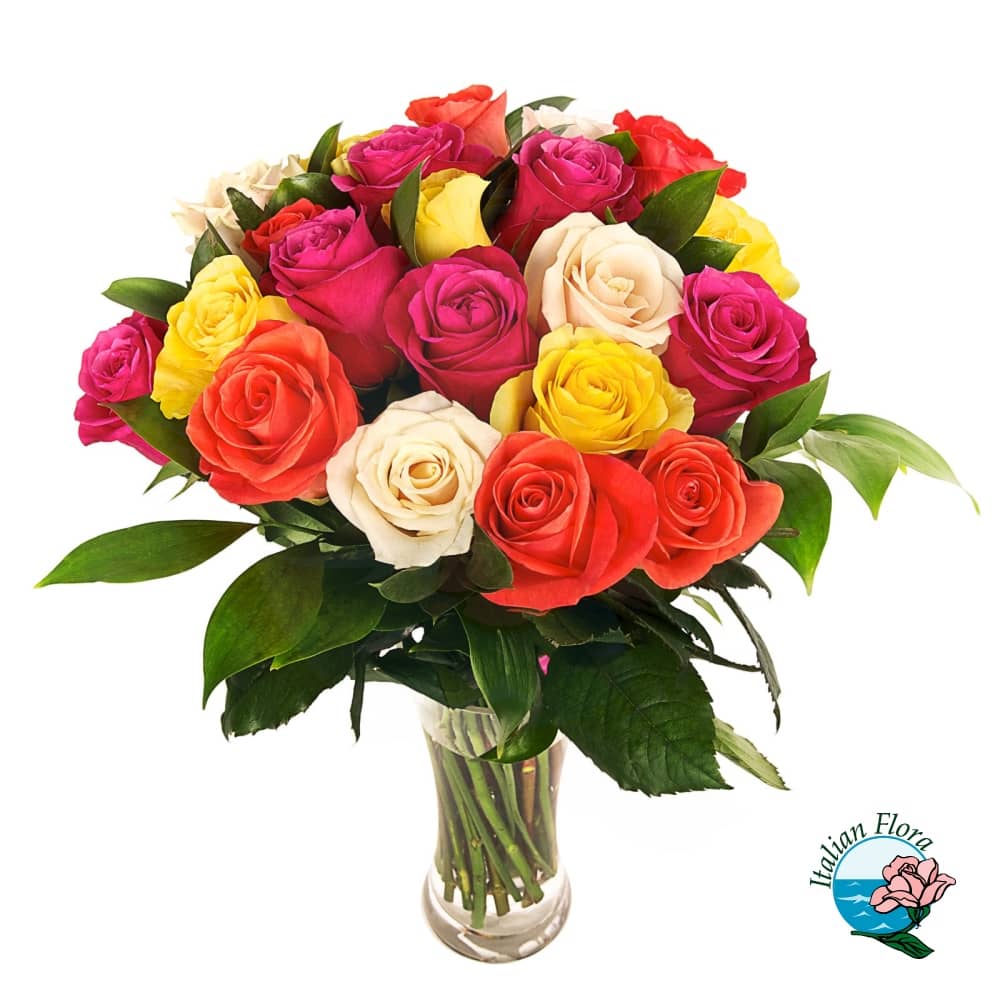 Celebrate the language of flowers with the Bouquet of 24 Mixed Color Roses, exclusively from Italian Flora. This delicate and vibrant arrangement combines the charm of assorted rose colors, symbolizing a range of emotions — from admiration and gratitude to joy, affection, and sincere love.