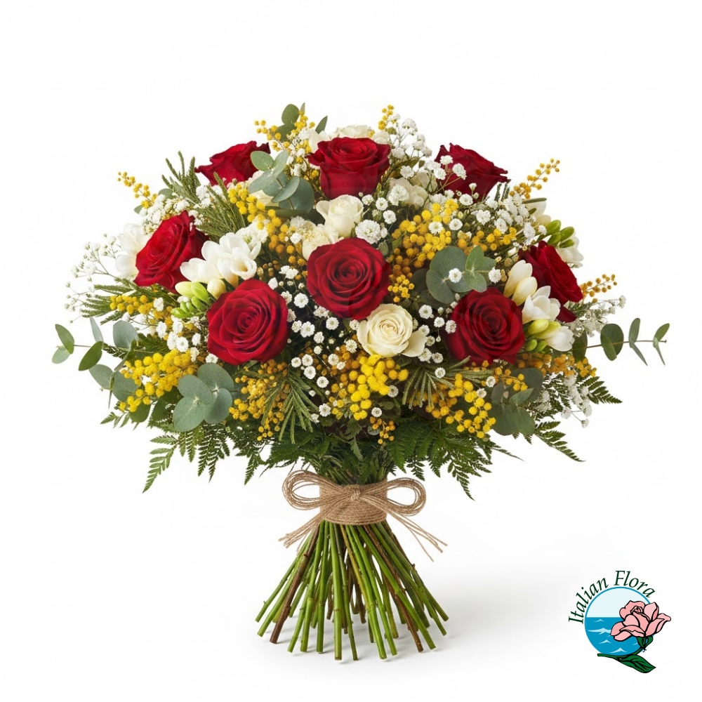 Each flower in this bouquet is meticulously selected by ItalianFlora’s expert florists to ensure freshness, longevity, and exquisite presentation. The red roses symbolize passion, romance, and deep affection, while the white flowers add a sense of purity, serenity, and elegance. The vibrant mimosa, with its golden blooms, brings warmth, joy, and cheerfulness, enhancing the bouquet with a touch of seasonal charm and energy. Together, these flowers create a harmonious and sophisticated arrangement that captures attention and touches the heart.