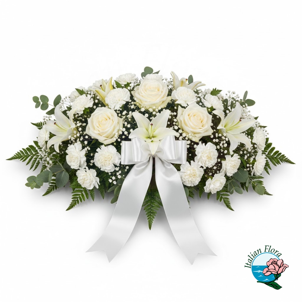 With Italian Flora’s international delivery service, you can send this white flower funeral arrangement to any destination. Trust us to convey your condolences with professionalism, punctuality, and heartfelt sensitivity