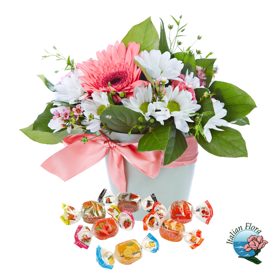 Delicate and refined Pink and White Bouquet with candies. Send a beautiful bouquet composed of top-quality pink and white flowers, with the addition of delightful candies, for international flower delivery for any occasion, from Italian Flora. This pink and white bouquet, sent directly from top local florists! It is a sweet and special way to express your feelings in a memorable manner.